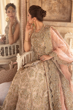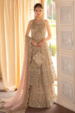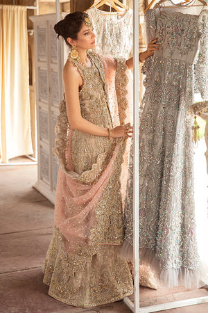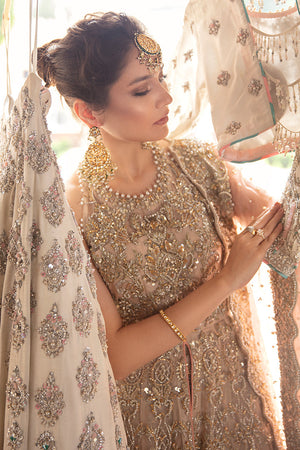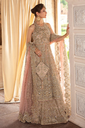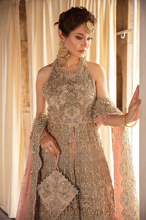 The bold and regal ensemble,Jiya is a paneled front open organza gown. It is paired with an organza lehnga with sprawling hand crafted embellishments. An opulent statement design is paired with an accent color dupatta, the perfect hue of pink. Intricately embellished all around the border and glittering spray throughout.
