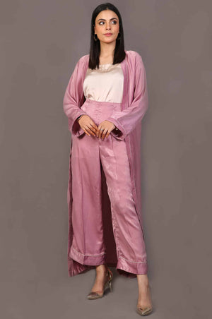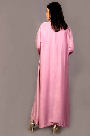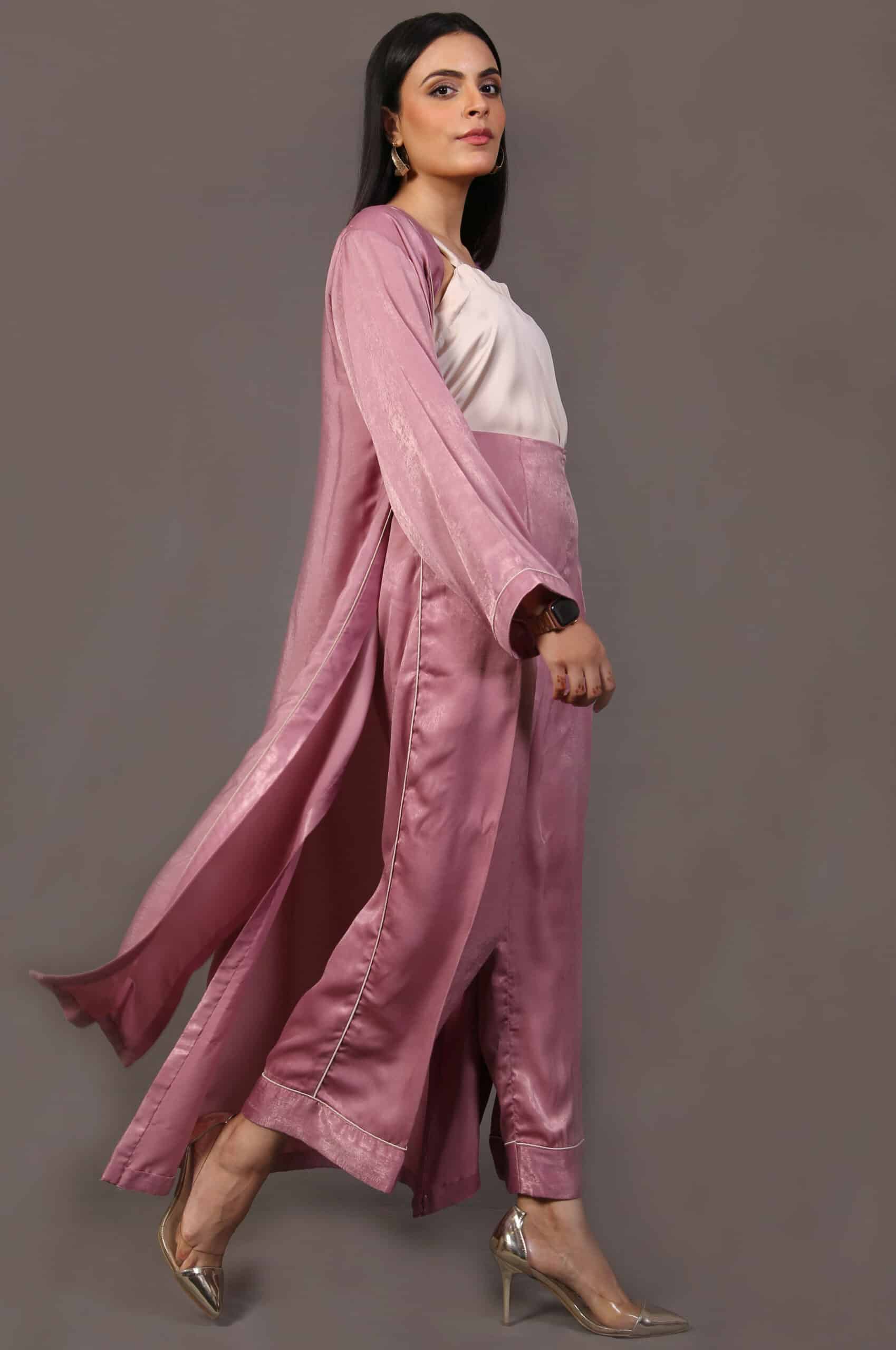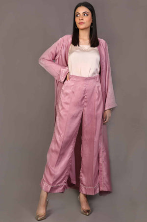 A very detailed stitched light pink silky side slit velvet gown, with hi waisted pants and beige tank top.