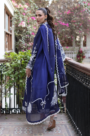 An exquisite navy blue raw silk long shirt, meticulously adorned with tila patti detailing, complemented by sleek cigarette pants. The ensemble is paired with a medium silk dupatta, featuring delicate organza pallo accents, and further elevated with refined white embroidery.