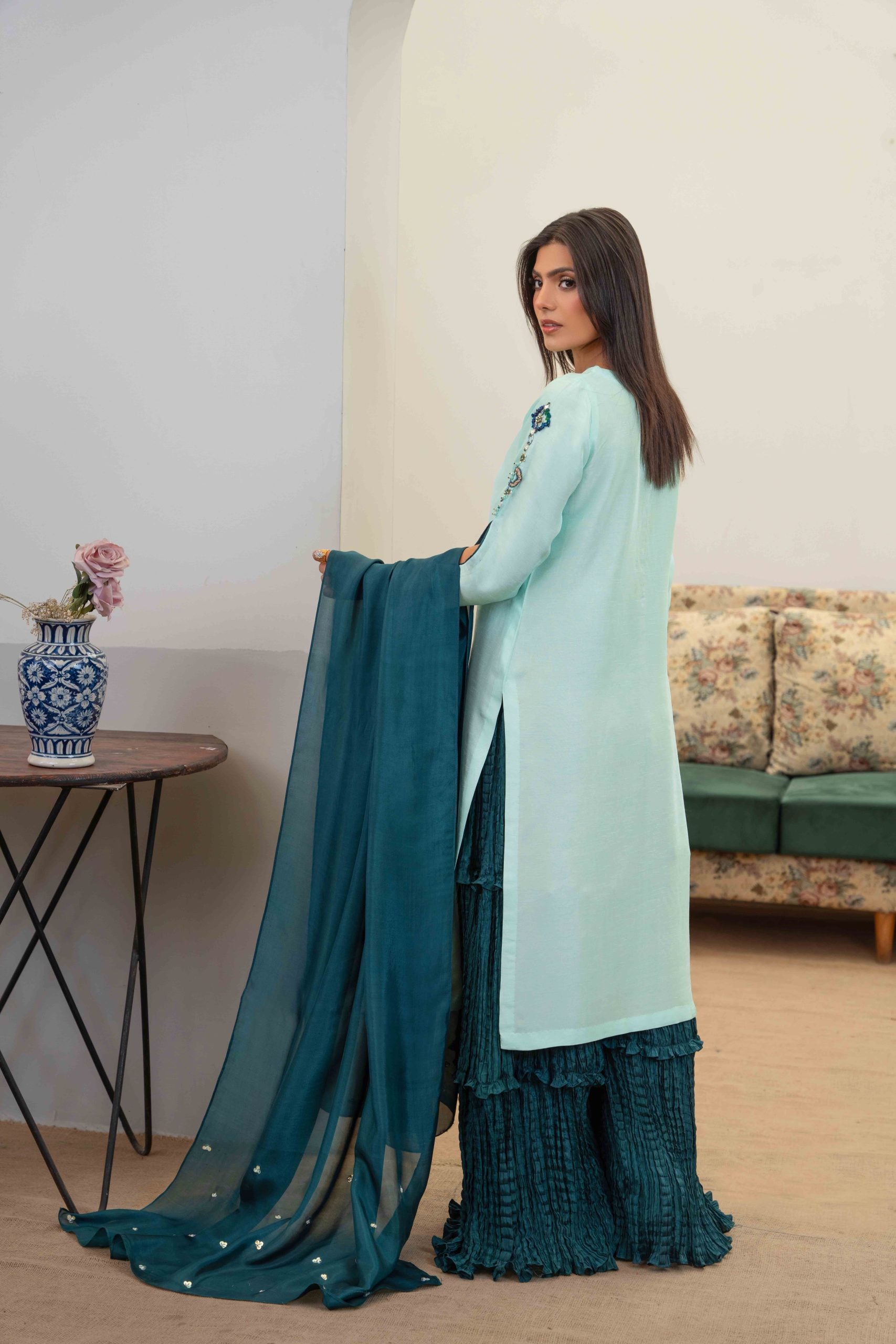 Indulge in ultimate sophistication with turquoise shirt creating a rich and opulent look. The neckline and sleeves is adorned with intricate hand embellishment on it. Paired with crushed teal sharara and hand embellished dupatta.
