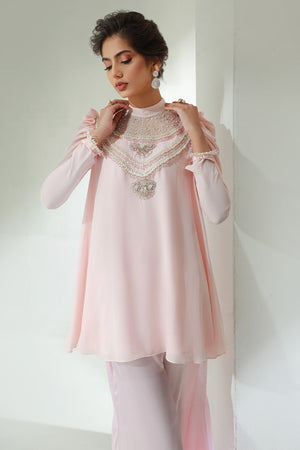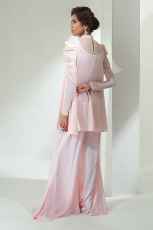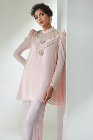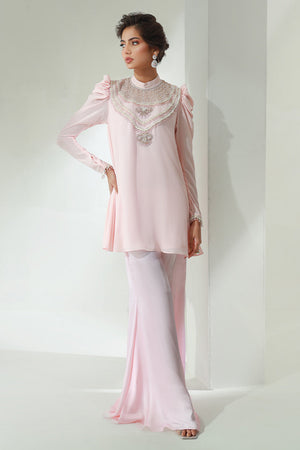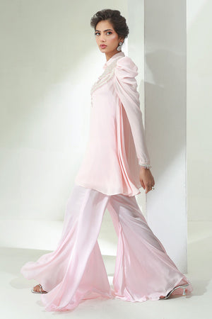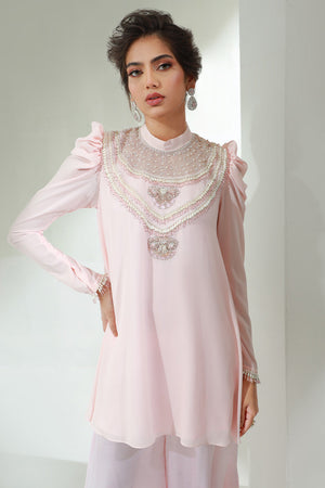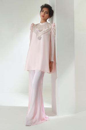 This elegant pink silhouette is crafted from georgette fabric and features intricate embellishments of pearls, crystals, and sequins on the neckline. It is complemented by puff sleeves and flared, seamless silk pants, making it an ideal choice for any party or special occasion.