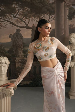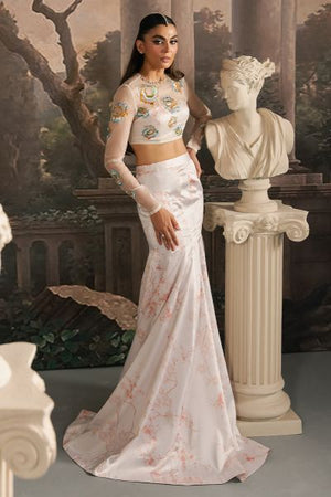 This majestic ensemble is a true symphony of elegance, embodying sophistication and allure in every detail. The figure-enhancing digital printed shamooz silk fishtail silhouette, paired with a finely Embellished blouse, radiates timeless charm enriched with luminous hand embroidery of crystals and cutdana, transforming simplicity into artistry. Cascading pearls weave through delicate floral motifs, flowing gracefully down the skirt like a celestial cascade, evoking an aura of ethereal grandeur