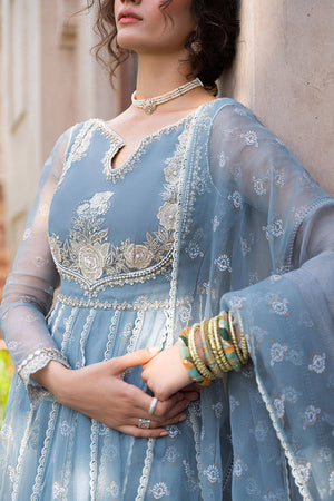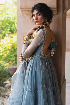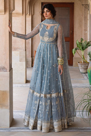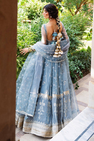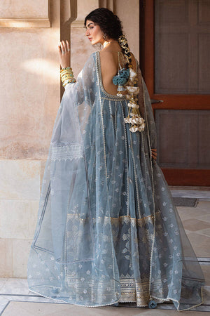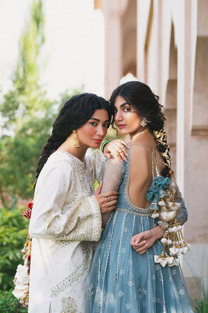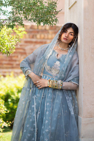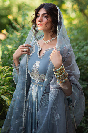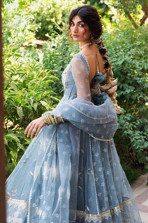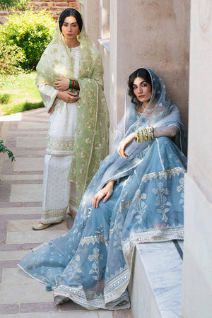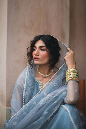 Introducing the "Justaju" ensemble from MNR's mesmerizing Din Mein Khwaab collection, created with exquisite artistry for Eid ul Azha. This ethereal masterpiece, in an enchanting shade of misty periwinkle, features a block-printed organza peshwas adorned with traditional Mughal florets and large bouqets of flower motifs. The ensemble's multihead embroidered borders add a touch of opulence, while the machine-embroidered blouse, delicately accented with minimal adda work, exudes understated elegance. The look is completed with a dupatta showcasing three distinct panels: two screen-printed, and a middle one enhanced with block printing and a checkered pattern on organza.