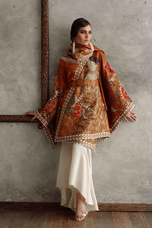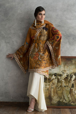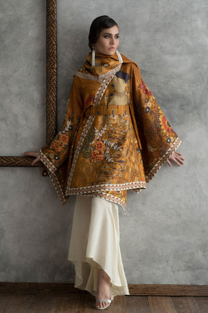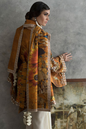 STYLE: Klimt inspired pure silk digital print A line cross wrap art with flared sleeves. Embroided on front and sleeves with thread flowers and stems worked in silver zardozi SHAWL: Digitally printed shawl in pure silk with silk backing, accessories edging on two corners of shawl BELT: Optional fabric belts given for the youth without any loop on outfit.Fabric: Pure silk