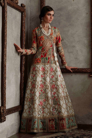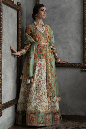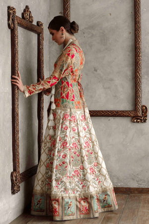 Pure silk digitally printed and fully embroidered in gold OG's, kalis embroidered in resham, sequence and gold, zardozi embroidery on neck and chest. SHAWL: Digitally printed shawl in pure silk with silk backing, accessories edging on two corners of shawl. BELT: Optional fabric belts given for the youth without any loop on outfit.