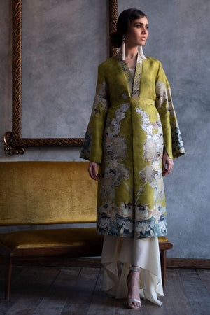 STYLE: Pure silk printed tunic with silver work neckline and assymetrically placed embroided bunches worked in silver, ivory and gold thread with outlines in print in silver. BELT: Optional fabric belts given for the youth without any loop on outfit.Fabric: Pure Silk