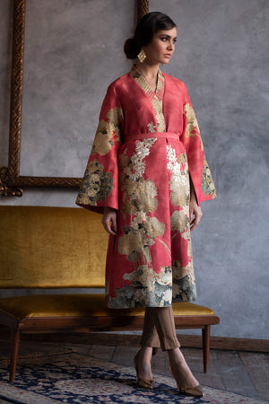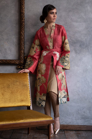 STYLE: Pure silk printed tunic with silver work neckline and assymetrically placed embroided bunches worked in silver, ivory and gold thread with outlines in print in silver. BELT: Optional fabric belts given for the youth without any loop on outfit.Fabric: Pure Silk