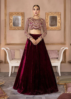 Kaawish is an absolute magical plum organza choli featuring lustrous embellishments in monochromatic hues. The scalloped choli is paired with a dreamy draped velvet lehnga, making this exquisite look a must have.