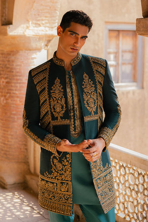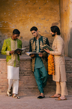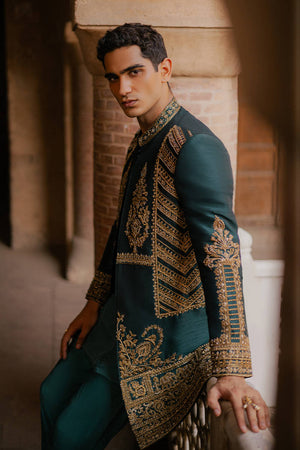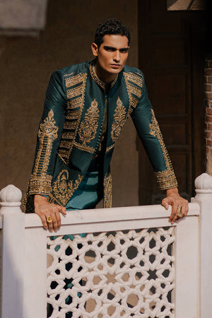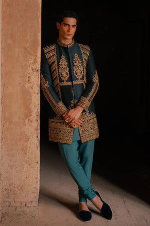 Kafil from the 'Raag Darbari' collection, in a sumptuous shade of peacock jade, epitomizes Mughal opulence. This pure Indian silk jacket, adorned with golden metallic tilla embroidery and intricate hand embellishments, showcases richly embroidered Mughal floral bouquets across the chest. The design is further enhanced by scrolls of elephants and floral patterns inspired by Mughal frescoes. Heavily decorated and exquisitely detailed, this jacket is an opulent choice, fit for a groom.