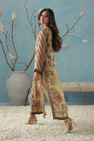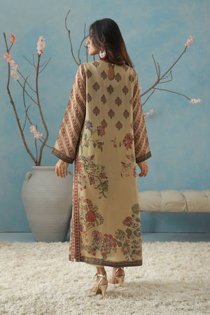A graceful A-line long shirt featuring box pleats, adorned with intricate Mughal chintz-inspired bright red motifs beautifully outlined in golden thread. Detailed embellishments highlight the neckline and belt, adding a touch of elegance. It is paired with the effortlessly plain trouser for a balanced and sophisticated look.