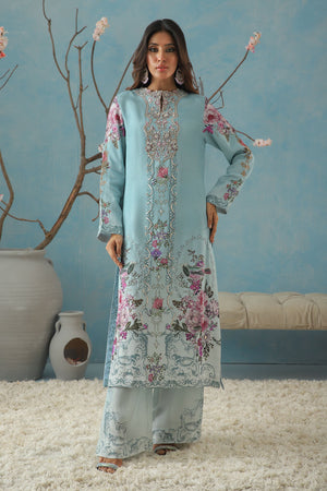 A stunning A-line shirt featuring soothing gradients of blue adorned with bright pink summery flowers and delicate bird prints. Paired with printed trousers, this outfit is finished with exquisite pink, purple, and silver embellishments in zardozi work. The cutwork neckline adds an intricate, elegant detail, perfectly blending artistry and charm.