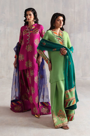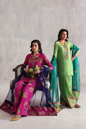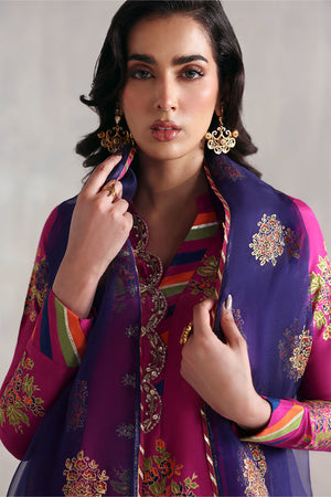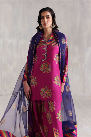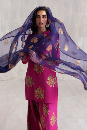 Embrace timeless elegance with this purple block print shirt, made from luxurious Korean raw silk. Paired with matching Korean raw silk pants and a pure organza dupatta, this ensemble captures the essence of sophisticated style and intricate craftsmanship.