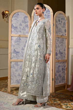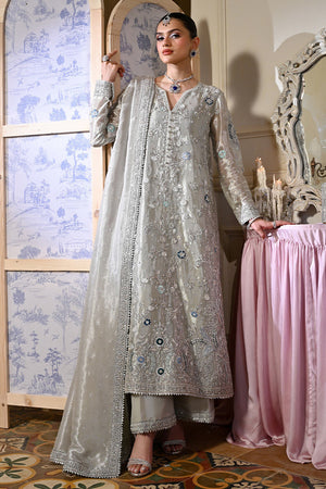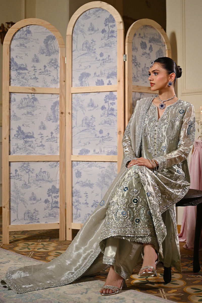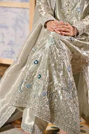 A timeless silver lamé ensemble featuring a long shirt adorned with delicate floral motifs and resham embroidery, paired with a classic izaar. The look is completed with a lamé dupatta, beautifully accented with teal details, sequins, and hand-embellished borders, adding depth and elegance. A perfect harmony of shimmer and craftsmanship, finished with tissue lamé for a refined touch.