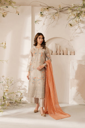 A timeless tale with a contemporary twist, this shimmering tissue ensemble is for the woman, whose love story begins with herself and embraces the world. Beautiful hand-embroidered aari work in the hues of peach and grey on a shimmery ivory base with nature-inspired motifs.