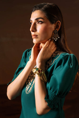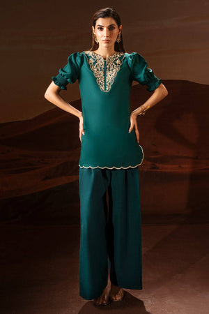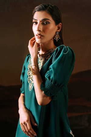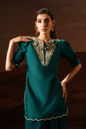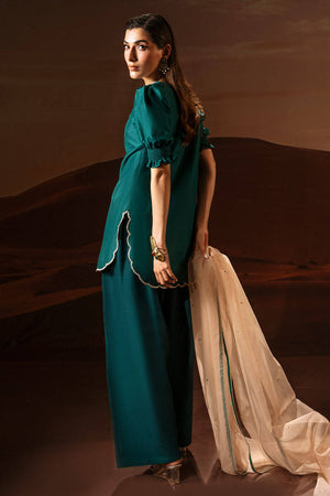 A striking bottle green short pure raw silk shirt, elegantly adorned with subtle and delicate hand embellishments on the neckline, showcases sophistication at its finest. The refined puffed half-sleeves add a graceful touch to the overall look, while the scalloped, embellished hem—a signature Zainab Salman detail—infuses the design with unique charm. Paired with an exaggerated shalwar for a bold silhouette and a contrasting light brown and gold hand-embellished organza dupatta, this ensemble is undeniably a show-stopper, perfect for making a statement at any event.
