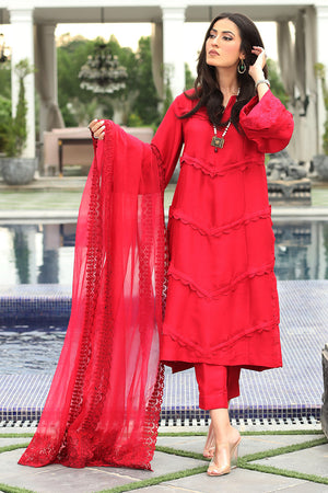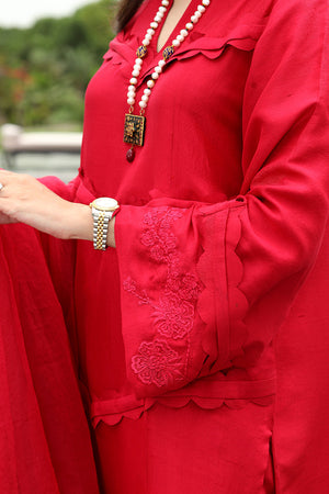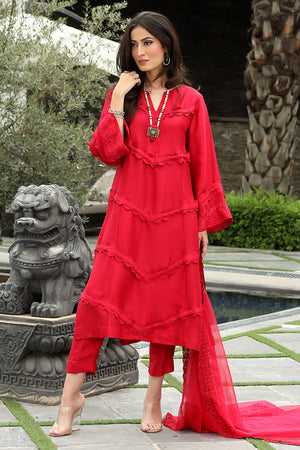 The eternal color of fashion RED look ravishing in the carefully crafted raw silk set. Unique stitching details balanced with beautiful embroidery on sleeves and organza dupatta makes this outfit an entirely different class.The shipping charges for all articles barring Bridals are as follows: