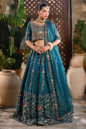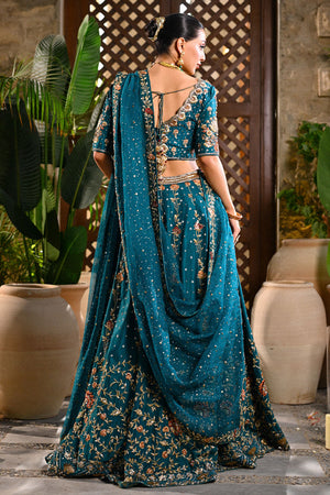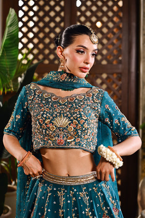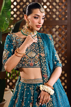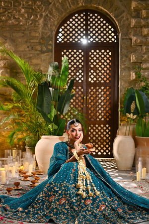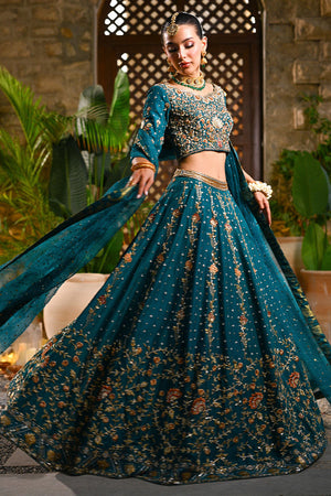 An emerald green lehenga choli crafted in raw silk and organza net, designed to radiate regal elegance. The lehenga features intricate trellis patterns and a striking floral border, brought to life with resham embroidery, dabka, nakshi, zardozi, and sequins. The choli is richly adorned with floral motifs, adding depth and delicacy to the ensemble. Paired with an ethereal organza net dupatta, scattered with sequins for a subtle shimmer, this look beautifully balances tradition and refinement — perfect for a timeless bridal statement.
