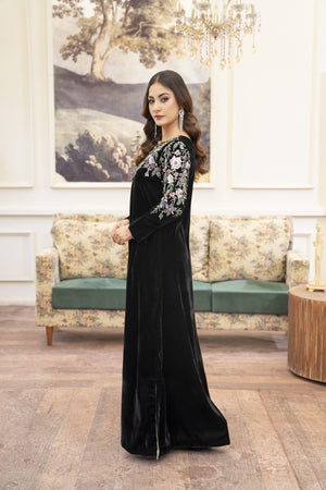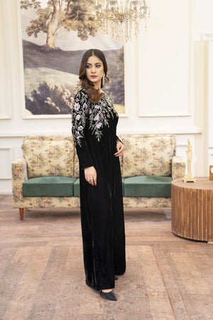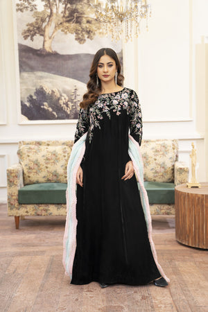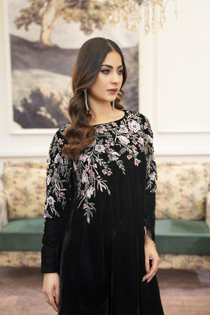 A captivating black velvet outfit which has an exquisite floral embroidery and hand embellishments with delicate multi stones, cut dana and sequins. The velvet exudes elegance with its charming colorful embroidery on front neckline and shoulders, adding a touch of sophistication paired with cigarette trousers and two tone organza crushed dupatta.