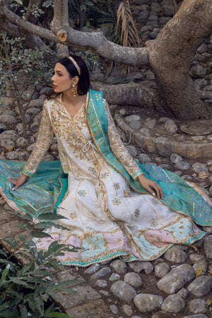 Embrace timeless beauty in our pure dotted cotton net angharkha, adorned with signature block prints using chunri blocks. The intricate ensemble is embellished with a melange of gota patti, cut Dana, and delicate sequins. Paired gracefully with a matching block-printed dupatta and pure rawsilk dhaka pants, this outfit is a symphony of tradition and sophistication.