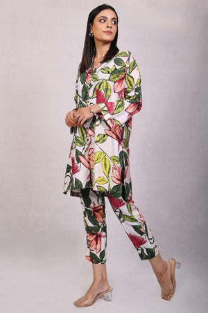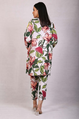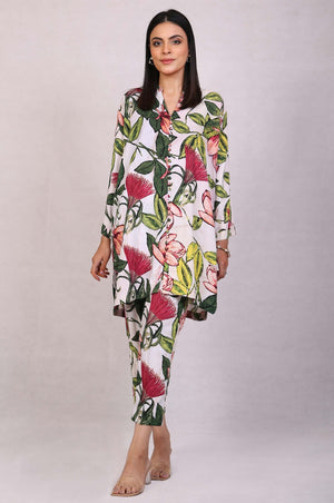 A floral printed two-piece chambray shirt with detailed stitching, loop buttons paired with capri pants.