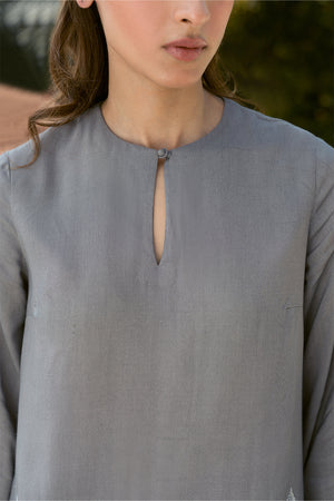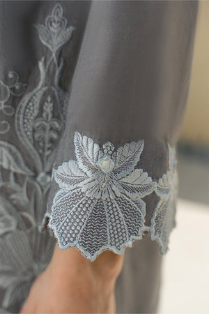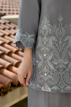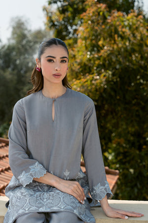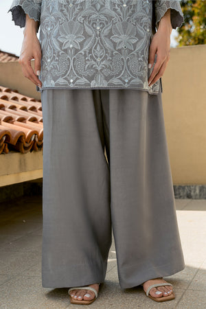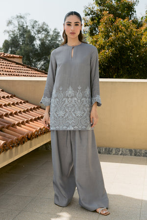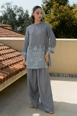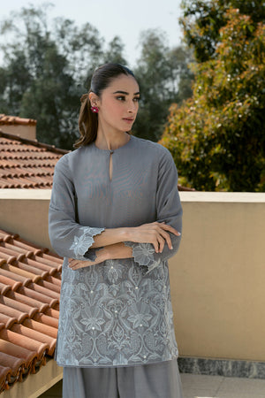 Dazzle this Eid with our breathtaking silver grey ensemble! This modern masterpiece reimagines the classic shirt and pleated pants, boasting show-stopping embroidery with mirror accents that will leave a lasting impression.