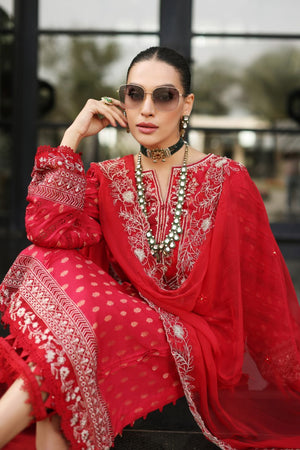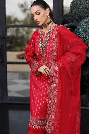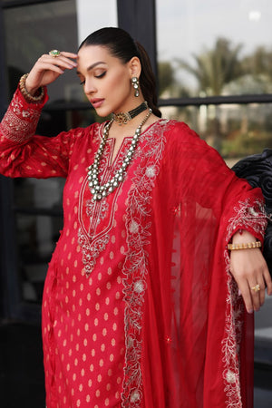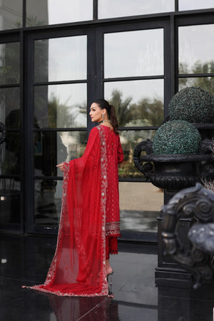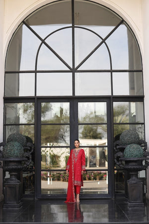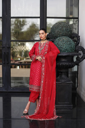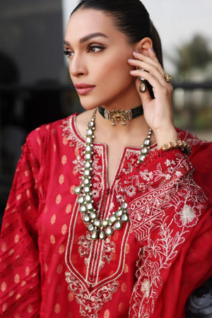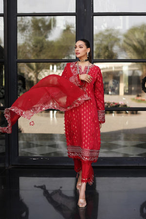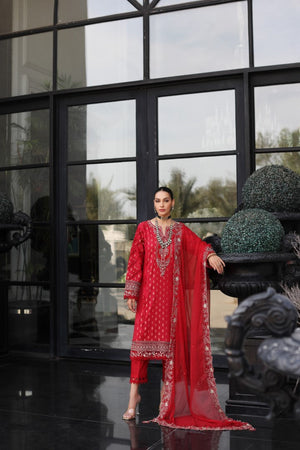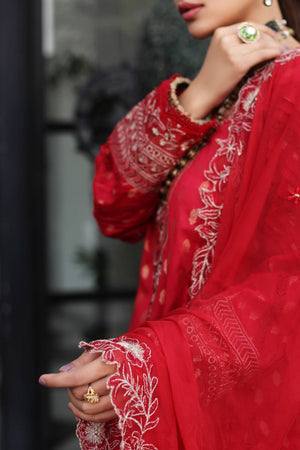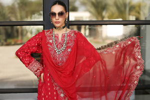 This classic palette of Red on jacquard fabrics will elevate your summer wardrobe floral embroidery in shades of red paired with chiffon embroidered dupatta finishing with scallop details & Lawn pants.