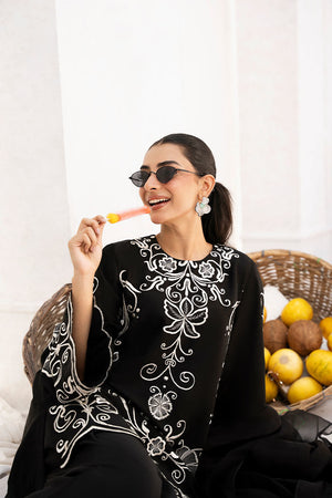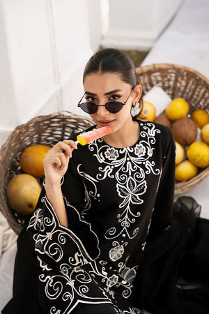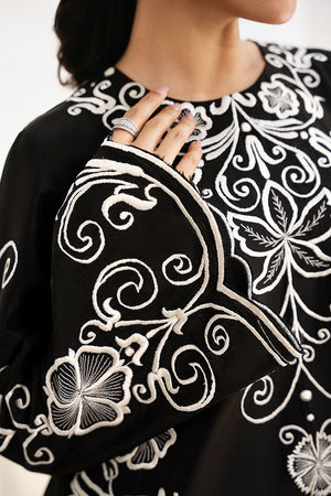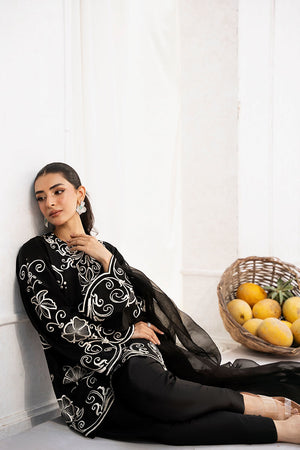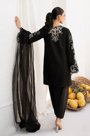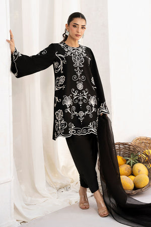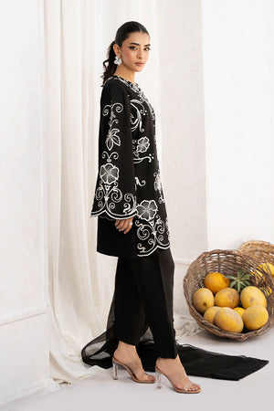 Black short shirt made from raw silk, featuring off-white resham embroidery in an art-nouveau pattern across the chest and shoulders. The shirt is finished with scalloped edges at the neckline and sleeve hems. It is paired with a black raw silk narrow shalwar, detailed with loop button accents on the sides. The look is complemented by an organza dupatta with raw silk detailing, adding lightness and texture to the ensemble.