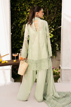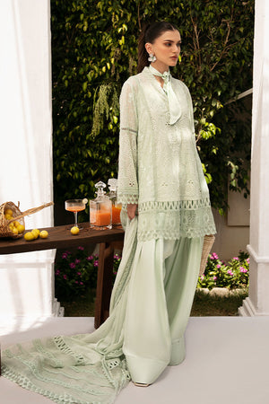 Mint khadi silk short shirt with schiffli embroidery, featuring a tila pati neckline adorned with sequins and Swarovski stone details. The shirt has organza borders for added contrast and delicacy. The back includes a unique cutout detail, and the sides are finished with vents, accented by paisley tassels. It is paired with a farshi shalwar for a relaxed, flowing silhouette. The look is completed with a medium-weight silk dupatta featuring organza, lace, and paisley details.