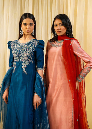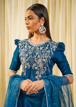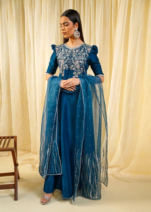 Description: A Timeless symphony in teal blue Elevate your wardrobe with this intricately embroidered masterpiece featuring delicate floral motifs and a sheer embellished dupatta. Perfect for festive occasions and elegant soirées.