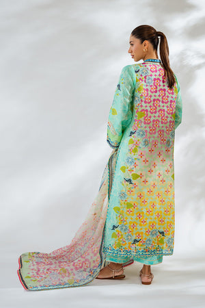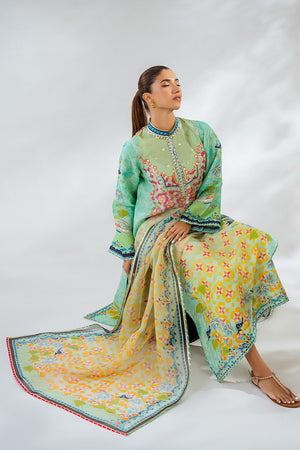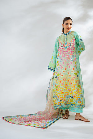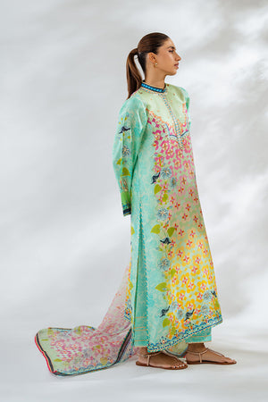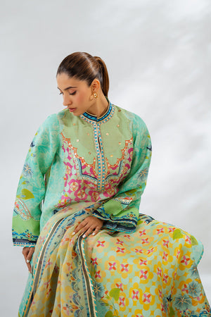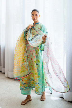 A refreshing mint hue meets a quintessential vibrant print on a timeless silhouette. An a-line shirt is cut from khaddi silk, elevated with gota details highlighting the print and the band collar neckline. A cascading organza dupatta adorned with geometric florals adds an enchanting touch, complemented by printed pure raw silk culottes with subtle gota details at the hem.