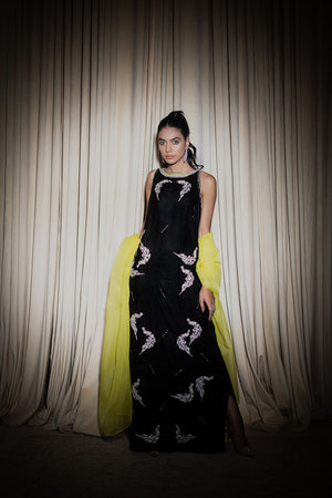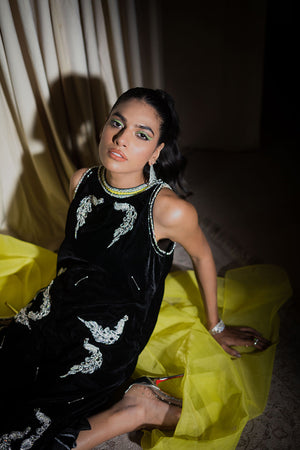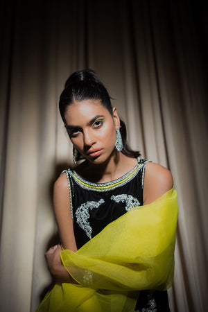 This scintillating long black velvet kaftan is screaming fashion! The sparkling hand embellished Mor motifs all over the shirt makes it a head turner outfit. The statement neon dupatta finishes off the look to ten!