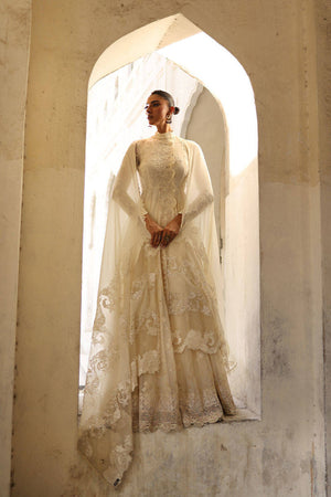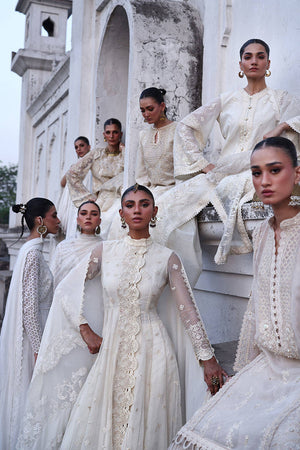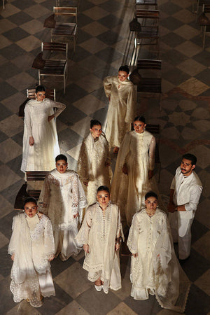 Crafted from embroidered check net, this full-flared angrakha peshwas is composed with studied grace: its panels thoughtfully arranged to move from densely embroidered booti sprays to more open, lighter work, allowing a soft rhythm to emerge across the surface. The flare is edged with scalloped cotton trims that lend a refined finish. Paired with a straight pant and a chiffon dupatta featuring embossed screen-printed patches that mirror the motifs of the peshwas, this ensemble offers a look for Eid that whispers, rather than declares, its sophistication.