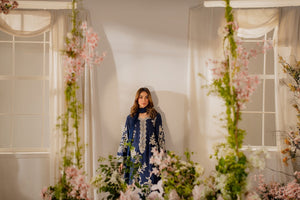 Immerse yourself in the enchanting allure of “Khwaab”, where a luxurious blue base is elegantly adorned with soft monotone and simmering embroidery, crafting a mesmerizing display of grace. Intricately detailed with an embroidered border, and sleek straight trousers, this stunning ensemble epitomizes high-end sophistication, perfect for adding a touch of opulence and ethereal beauty.