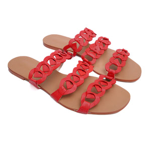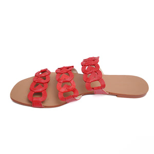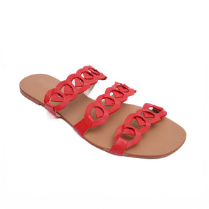 A 3-strap sandal crafted from V-shaped interlaced motifs in red leather. This slide is set atop a nude glazed insole, guaranteed to maximize comfort all day long.
