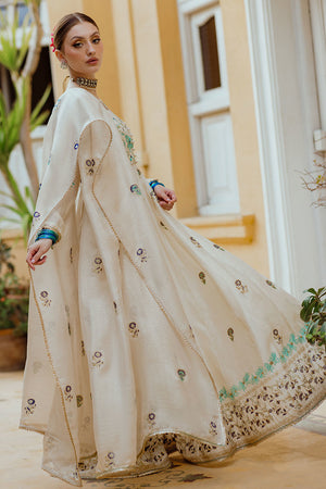 Step into sophistication with our Ivory kora cotton kalidar. Featuring an embroidered koti and block print details, it exudes charm. Paired with a shimmer net block printed dupatta and straight pants, it's a blend of tradition and contemporary style.