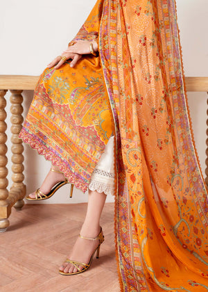 Radiate elegance and sophistication in this beautifully crafted two piece ensemble. This outfit features a luxurious pure raw silk embellished printed and embroidered shirt, adorned with intricate traditional motifs and a rich color palette dominated by warm orange and earthy tones. The shirt showcases detailed embroidery around the neckline, sleeves, and hem with a beautiful back tessel detail at the back enhancing its regal appeal. Paired with off-white embroidered silk pants featuring delicate lace accents at the hem, the outfit strikes the perfect balance between tradition and contemporary style. Ideal for festive gatherings and semi-formal events, this look promises effortless charm and grace.