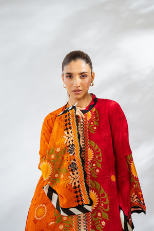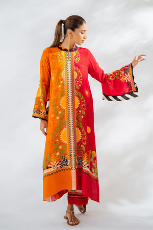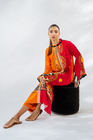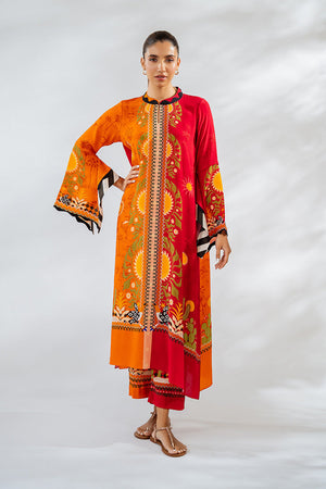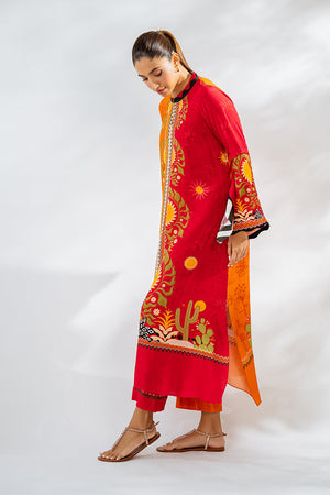 Shades of the tropical sunset are colour blocked on this relaxed flowing tunic paired with matching culottes; and featuring a quintessential Sania Maskatiya print. The crepe set has scalloped details on its sherwani neckline and the sleeves; epitomizing the functional flair of Kireen.