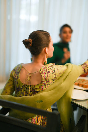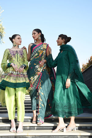 A digital printed pure raw silk peplum shirt with schiffli borders paired with straight cut shalwar and embroidered organza dupatta.The shipping charges for all articles barring Bridals are as follows: