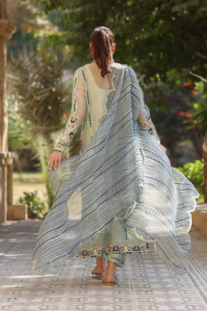 An exquisite celadon hued organza shirt adorned with intricate botanical aari embroidery and artisanal detailing exudes refined sophistication. Paired with a printed scalloped organza dupatta and matching pure rawsilk culottes featuring aari embellishment.
