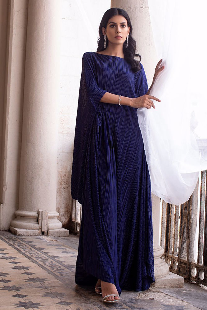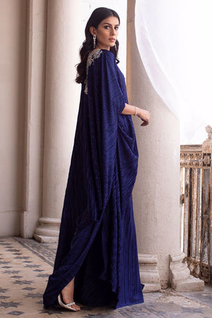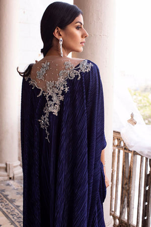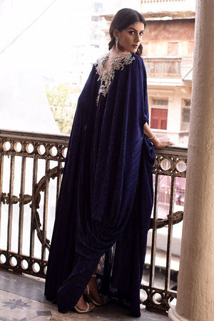 A stunning navy blue crush kaftan gives major fashionista goal. The 3D floral adornments scattered around back comprising of resham, sequins, pearls and beads enhancing the cowl.