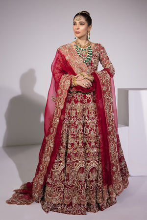 Three piece stitched outfit including pashwas, lehnga and duppatta. it is in red color. Fabric for pashwas is pure kathan organza, it is fully embellished from front, back and sleeves. It has lehnga as a lower in pure rawsilk with embellished border at the bottom. Kathan organza is used for duppatta. it has motif spray all over it with heavy embellished border on all four sides. It can be cutomised in any color.Fabric: Kathan Organza & Pure Rawsilk
