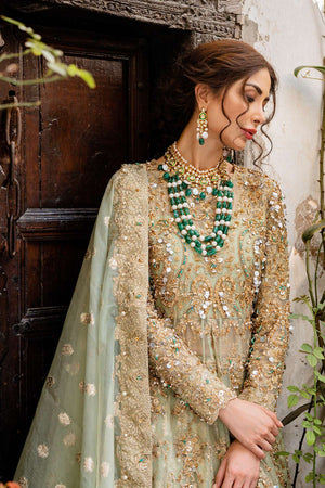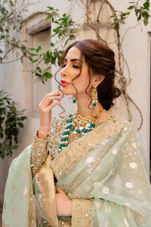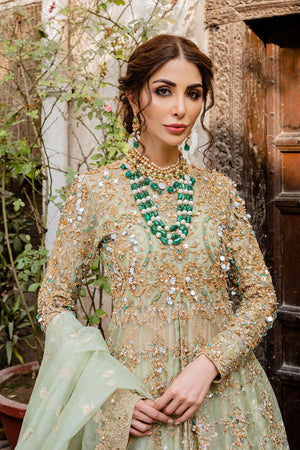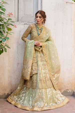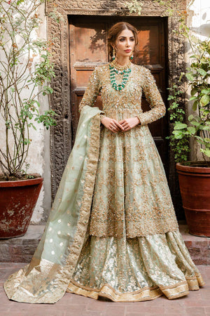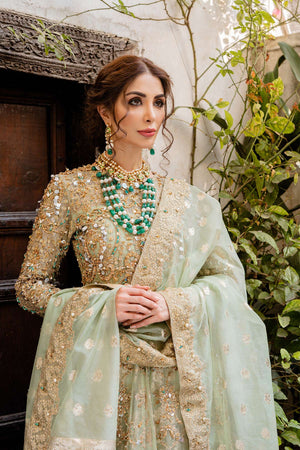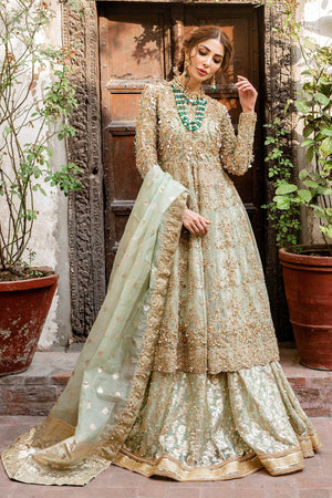 It is a 3 piece stitched outfit including shirt, lehnga and duppatta. It is in mint green shade but can be customized in any color. It's a frock with front slit, paired with a lehnga as a lower. Fabric for frock is pure kathan organza, fully hand embellished from front,back and sleeves. Badla fabric is used for lower with laces applied on bottom of it. Duppatta is a in badla fabric with embellished border patched on all four sides.Fabric: Shirt: Kathan Organza