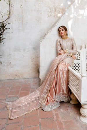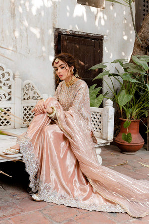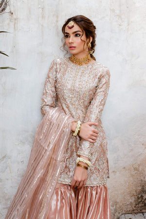 It is a 3 piece stitched outfit including shirt, sharara and dupata. It is in light pink color. Fabric for shirt is pure tissue with front and sleeves fully hand embellished. Sharara is made in pure tissue with embellished border at the bottom and spray all over it. Pure organza fabric is used for dupatta with laces on all four sides. Color options are not available.