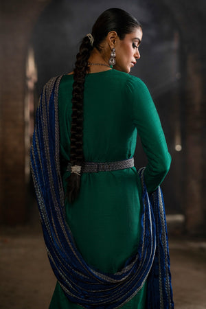 A silk saree adorned with intricate beadwork and sitara embroidery, beautifully matched with a mid-length jacket crafted from Korean raw silk. The saree showcases meticulous zardozi work, enhanced by an accompanying belt that adds an extra touch of sophistication to the ensemble.