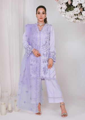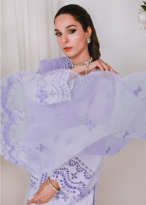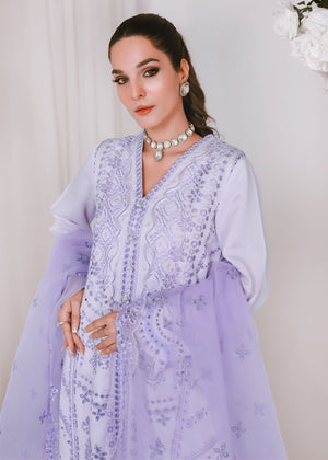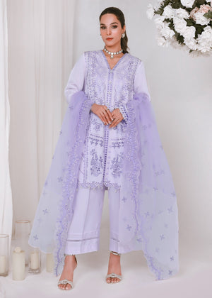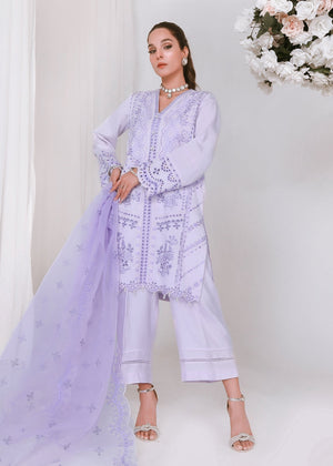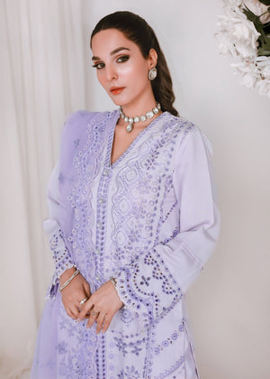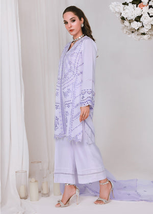 Embrace the beauty of luxury clothing with the Komal ensemble from our Misha Collection '24. This 3-piece set, featuring a khaddi silk shirt and culotte, offers a blend of comfort and elegance that is perfect for any festive season. The lilac hue and intricate embroideries make this outfit an epitome of ethereal elegance. The matching culotte and organza embroidered dupatta complete the look, adding a layer of sophistication and grace.