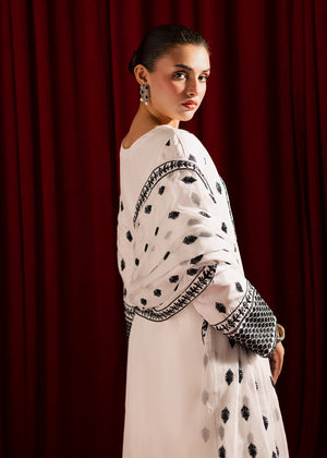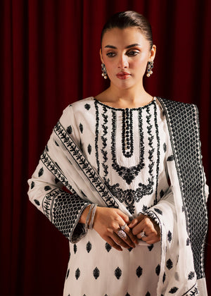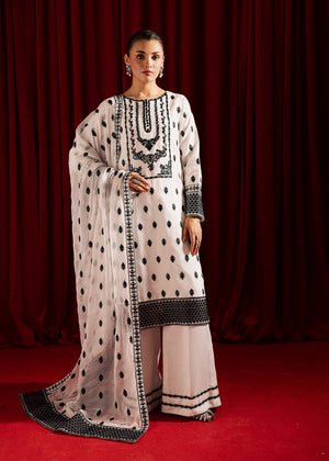 A masterpiece of elegance and artistry. This luxurious ensemble features a beautifully crafted Kurta set adorned with intricate embroidery and sequins, making every detail stand out. Outfit also contains classic palazzo pants with wide border that is full of intricate embroidery and sequins. The chiffon dupatta with chan and detailed borders add the perfect finishing touch, creating a graceful, polished look.