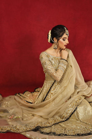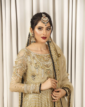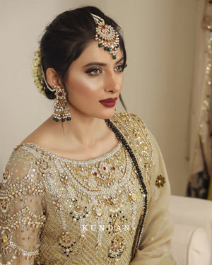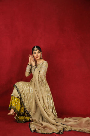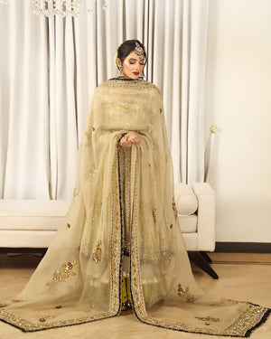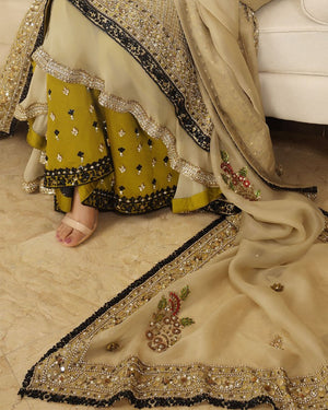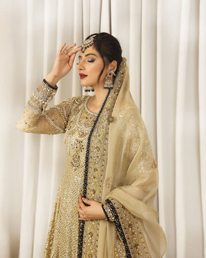 An elegantly flowing silhouette in ivory is adorned with hand made chikankaari; beautifully encrusted with stone and tappa kundan. Layered over with hand paint and mina work on top. Includes resham french knot, sequin & dabka. This grand design makes an opulent statement. The shirt is worn over a raw silk sharara with a border.