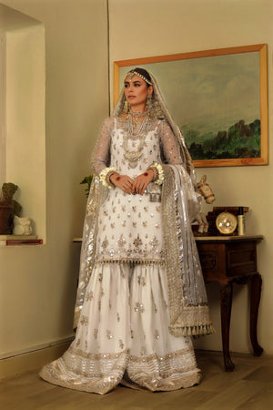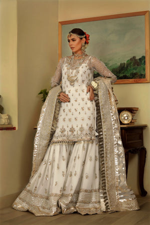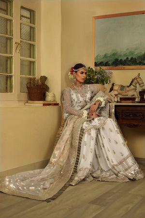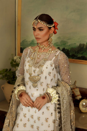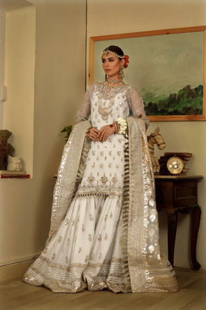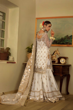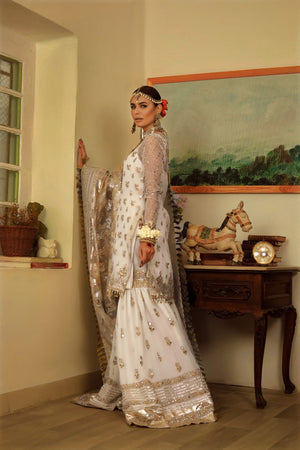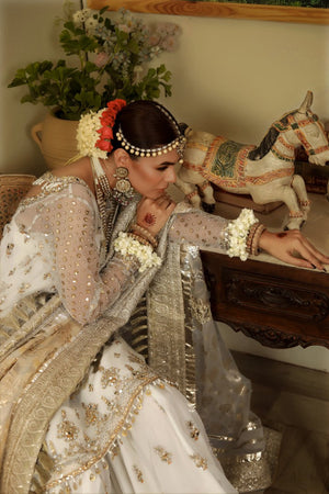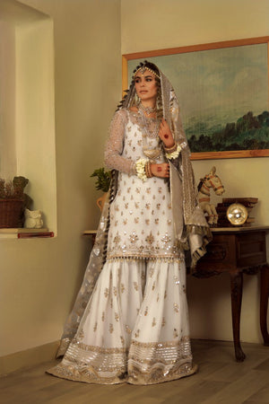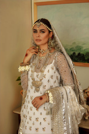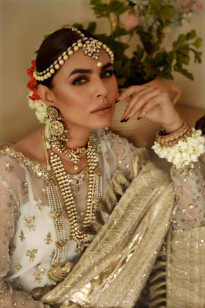 This royal ivory and gold festive dress is a stunning piece that will make you feel like a queen. The beautiful block print , gotta, mirror work, sequins, pearls, and stones add a touch of royalty to this beautiful design, making it perfect for your special occasion. The dress is made of a luxurious fabric that will keep you feeling comfortable and elegant all day long.