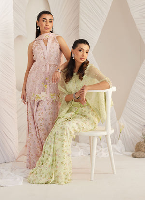 The mesmerizing jacket cut from pure organza in a blush pink is decorated with cut work botanical motifs all over is further uplifted with meticulously hand embellished pearls, Swarovski crystals, sequins and 3D flowers. The striking, translucent jacket is layered over a forever flattering, printed bustier.