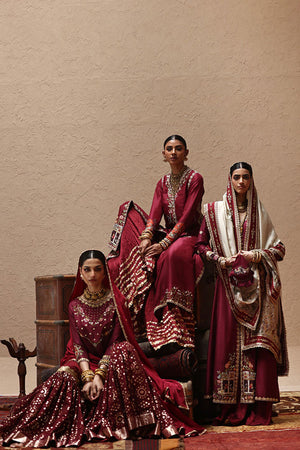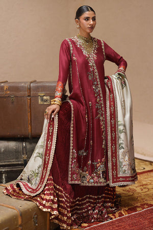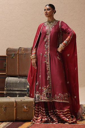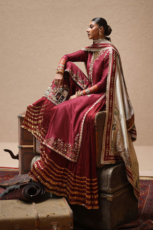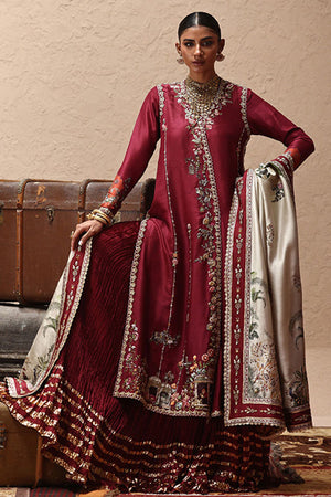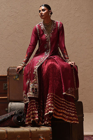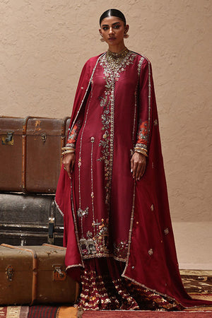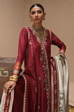 This chogha-style ensemble in pure 80gms raw silk features digitally rendered Mughal motifs, enriched with resham, zari, zardozi, and intricate embellishments of cutdana, crystals, stones, sequins, dabka, nakshi, and pearls across the front, back, and sleeves. Paired with crushed dhaka pants, it exudes refined elegance. Optional pure silk dupattas include a heavy four-sided gold embroidered bail with motifs, zardozi, and resham botis, or a lighter allover motif version. A beige sheesha silk shawl with Mughal-inspired digital print, zari, and zardozi offers a regal finishing touch.